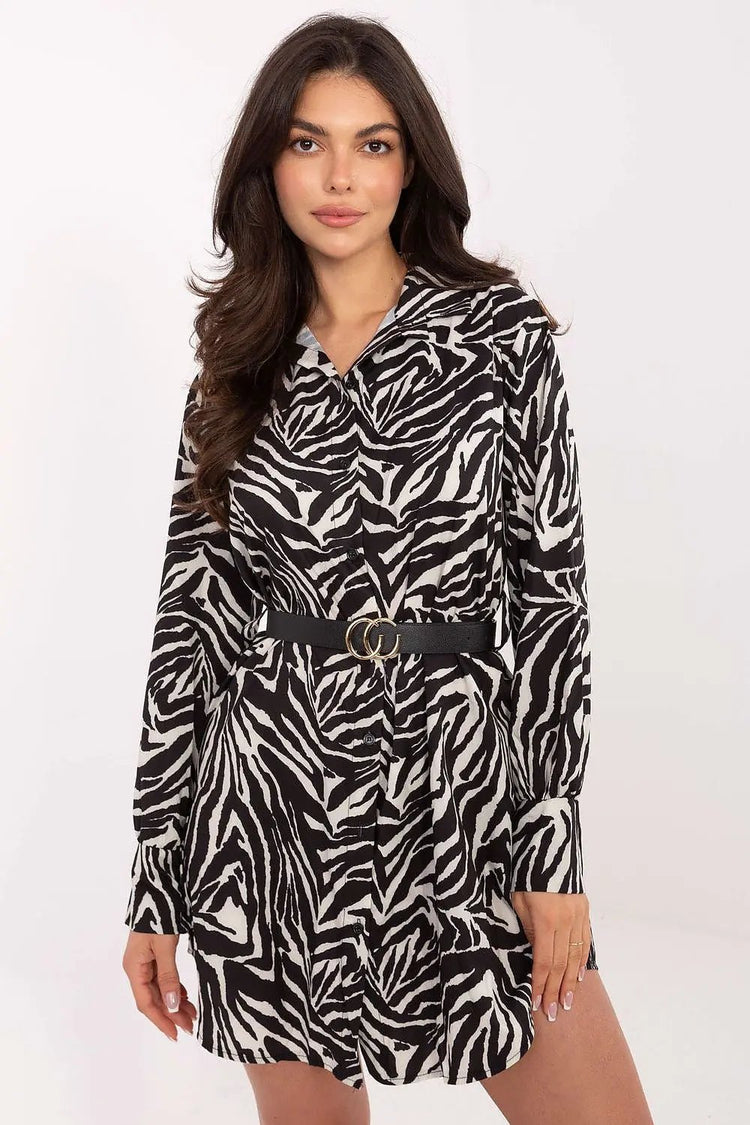 Stylish shirt dress with a simple cut is the perfect everyday proposition for women who like fashion with character. The animal motif gives it a predatory, modern expression, while maintaining elegance and feminine style. The mini-length model with long sleeves and a classic collar looks exceptionally stylish and versatile. The button closure along the entire length gives it lightness and a practical character, and the fastened belt allows you to emphasize the waist and adjust the dress to the silhouette. Made of a combination of polyester and elastane, it provides comfort and freedom of movement. It will work perfectly in everyday stylizations, both with ankle boots and elegant boots.